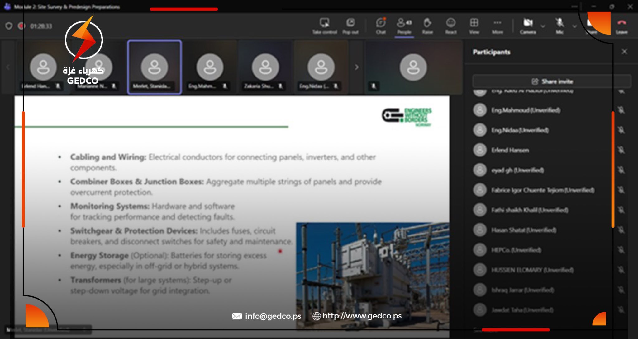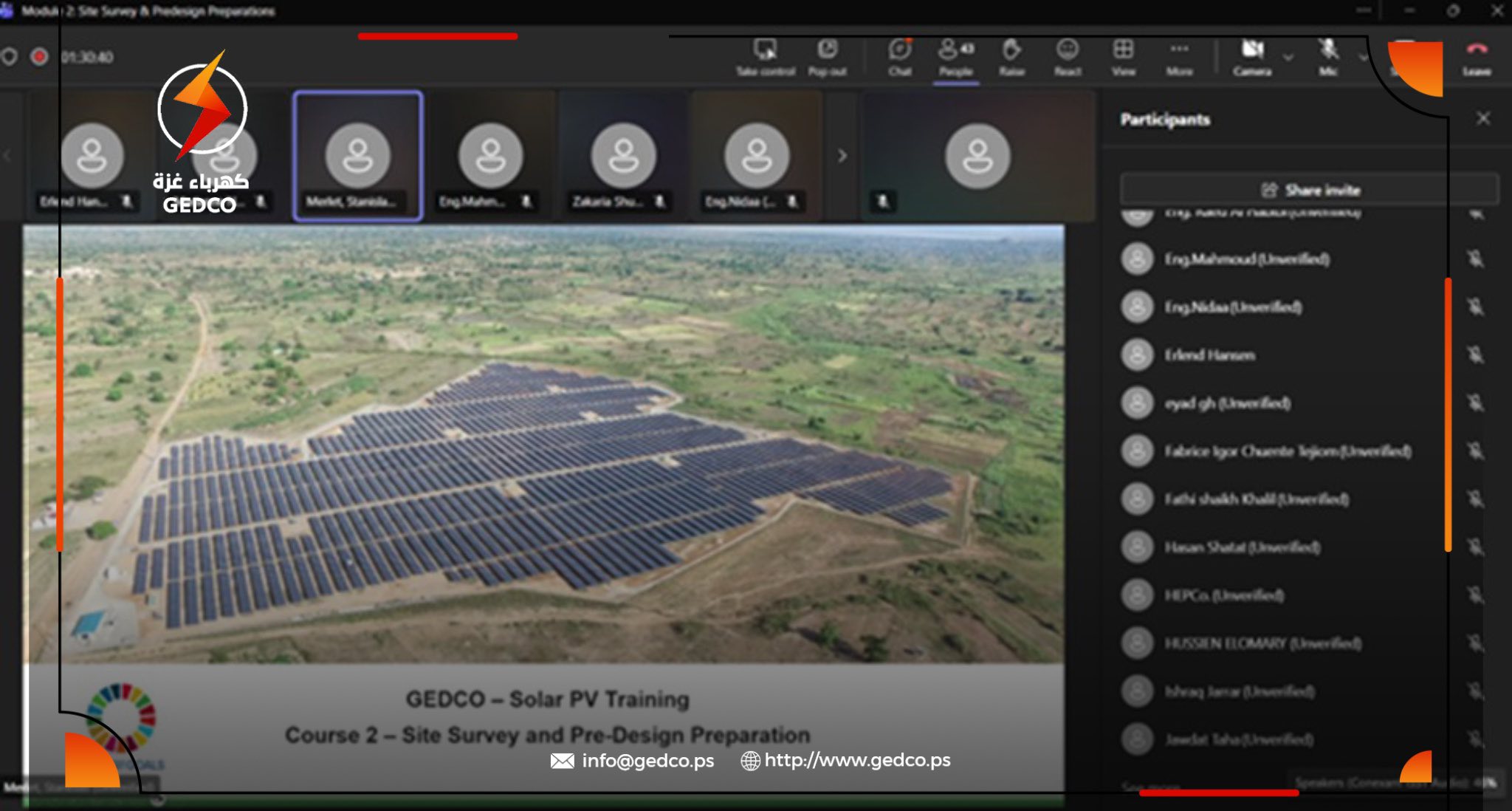 GEDCo, in partnership with Engineers Without Borders – Norway, has completed the first phase of a specialized training course in solar energy systems, with the participation of technical and engineering staff from local and international institutions, as part of efforts to enhance technical readiness for the recovery and rehabilitation phase.