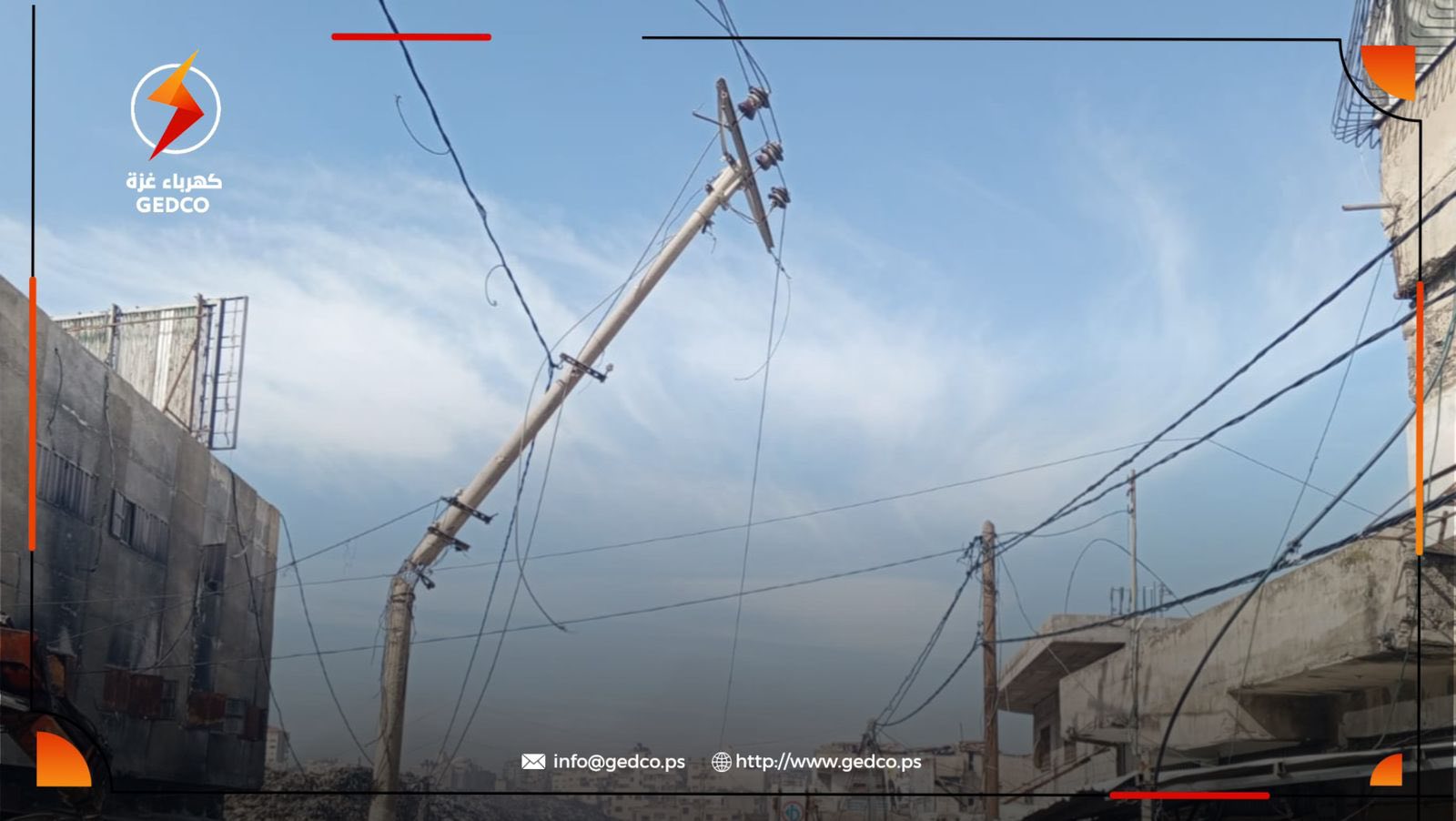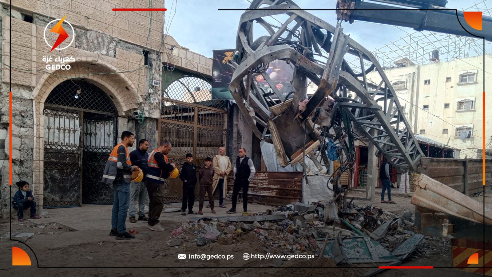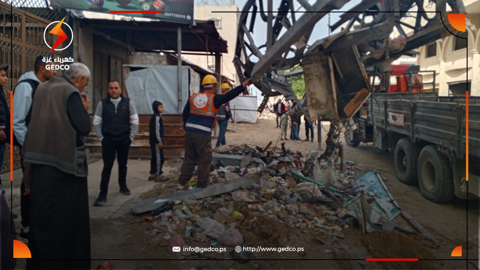 In response to urgent appeals from residents, Gaza Electricity Distribution Company (GEDCO) carried out an emergency field intervention in Tel Al-Hawa and Al-Rimal areas, removing and securing heavily damaged electricity poles that posed an immediate threat to civilians and surrounding homes.
