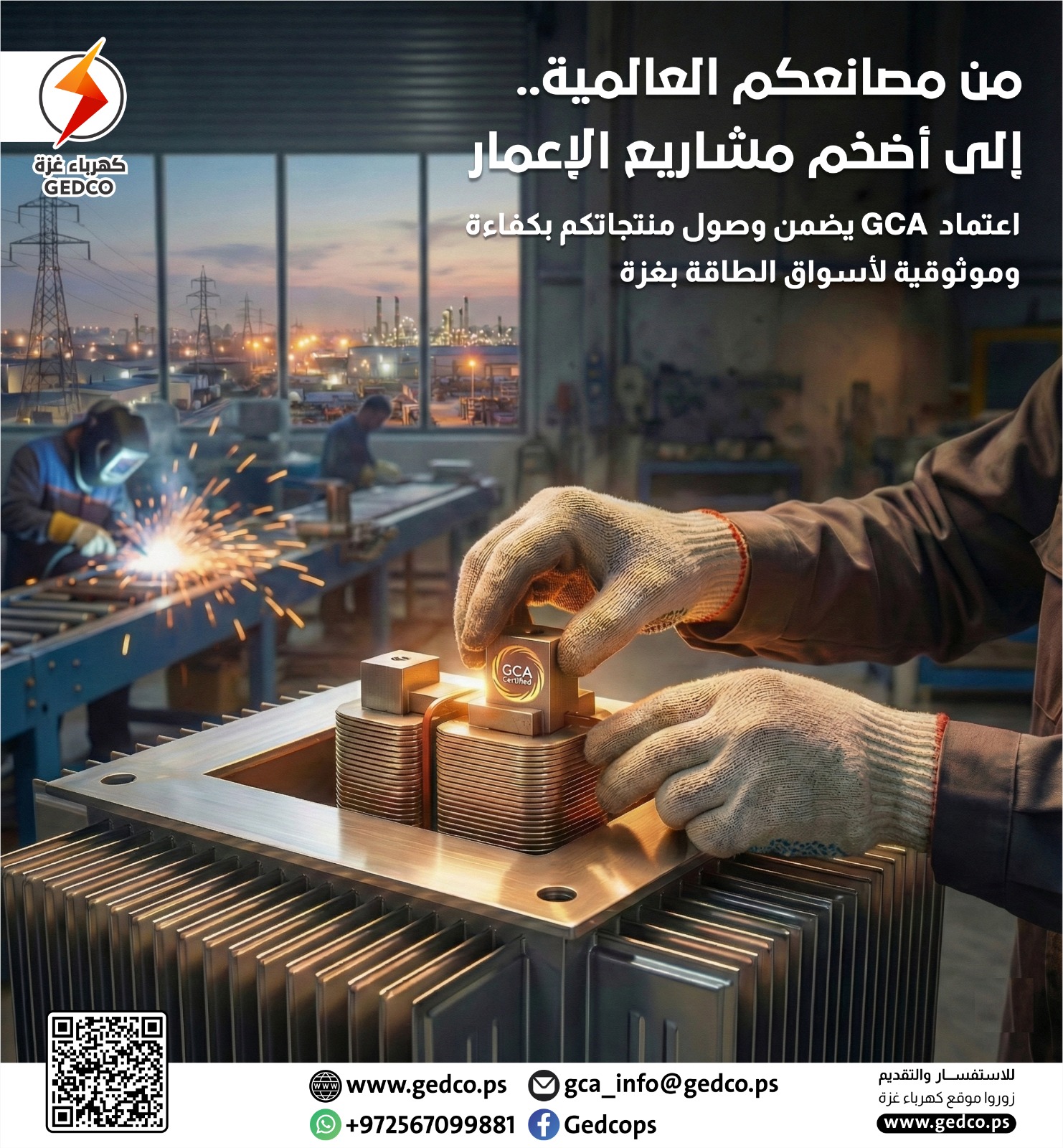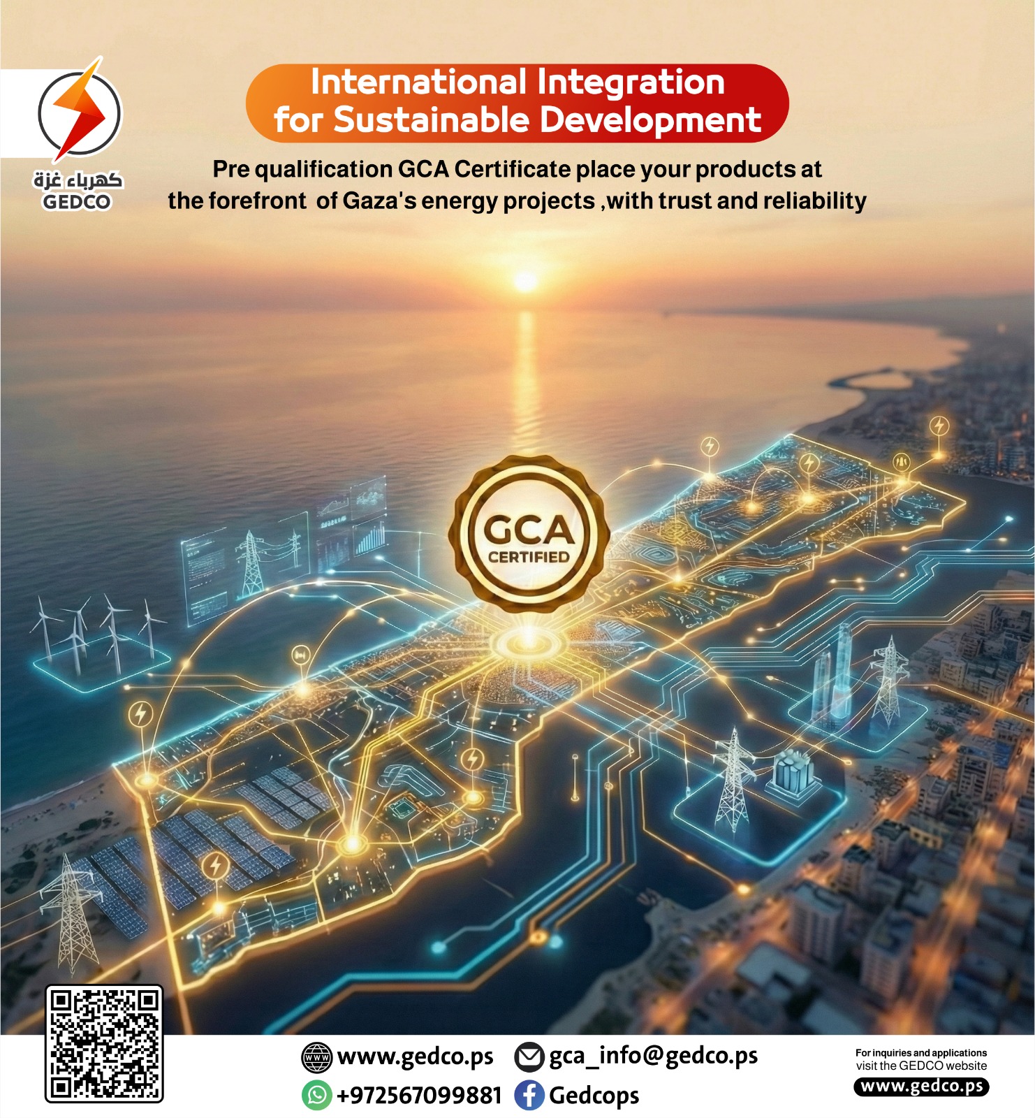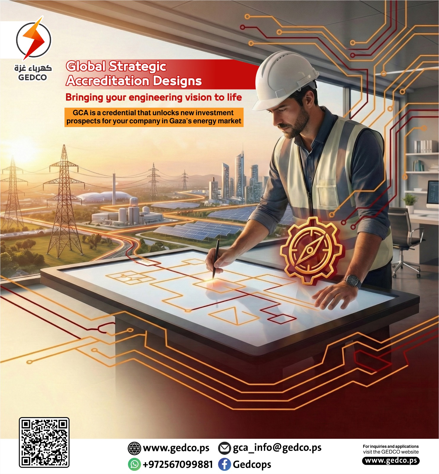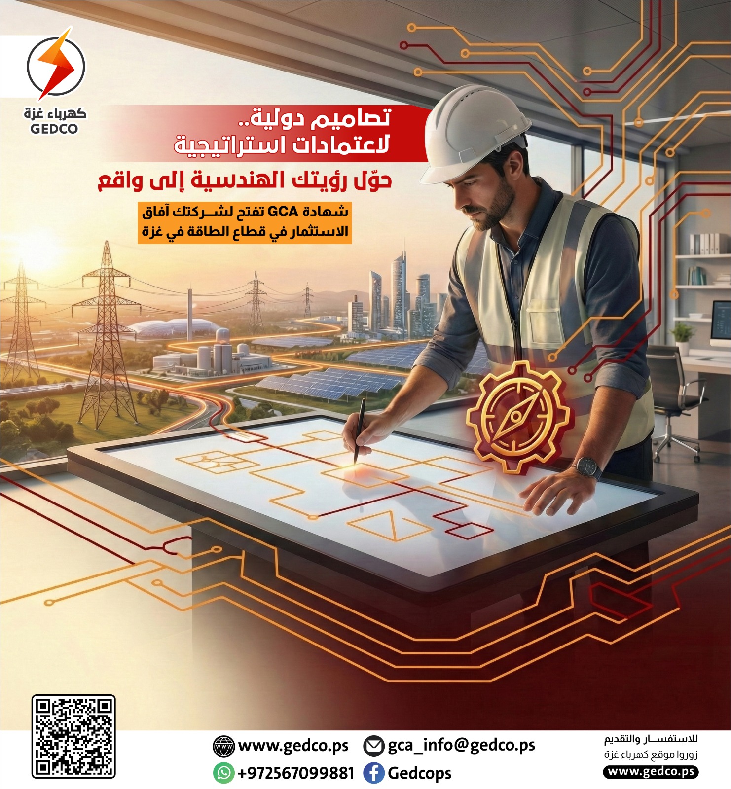 www.gedco.ps للاطلاع على تفاصيل الخدمة، وإجراءات التأهيل الخاص والعام، وآليات الاعتماد والتسجيل، والاستفادة من الفرص التي توفرها (GCA) للانطلاق نحو سوق كهربائي أكثر موثوقية واستعدادًا لمرحلة إعادة الإعمار.