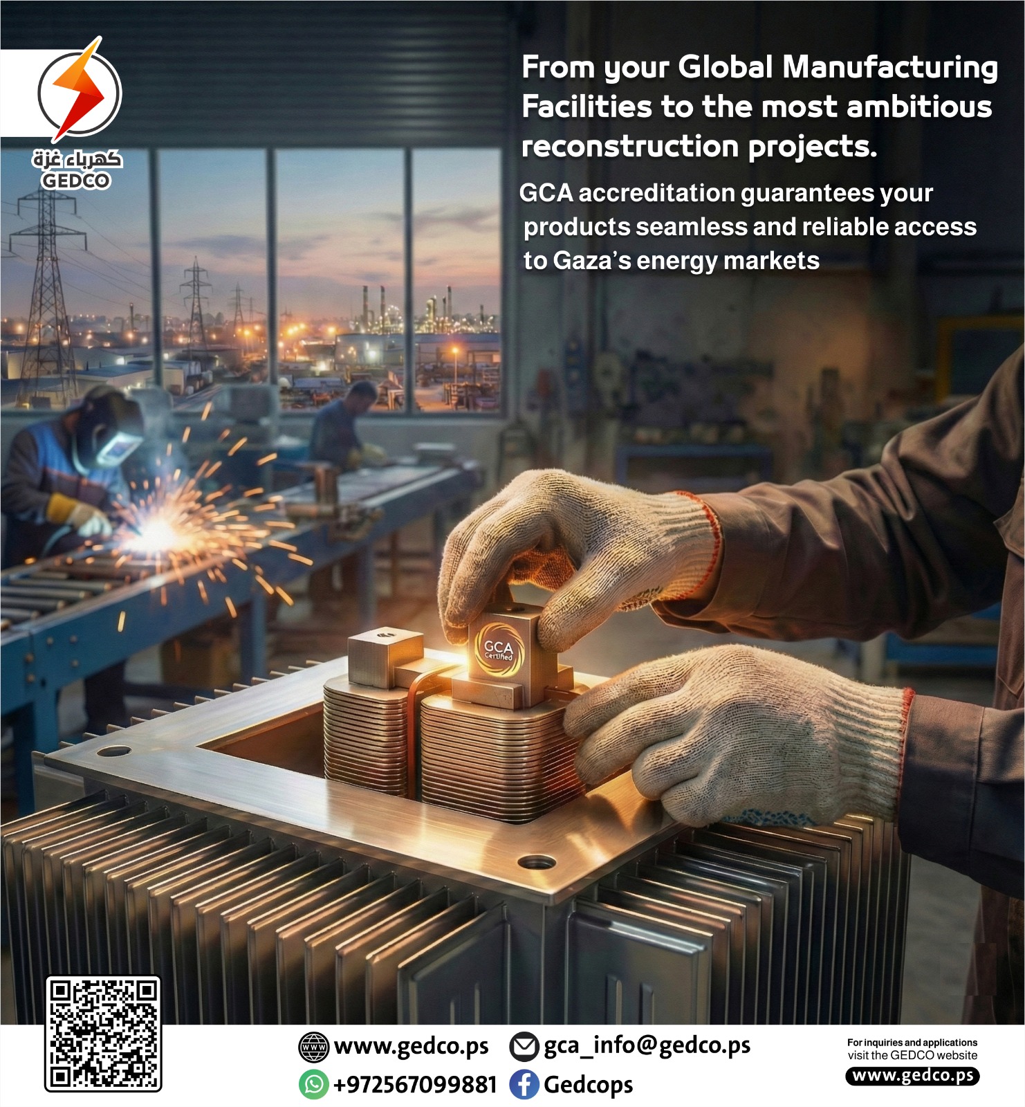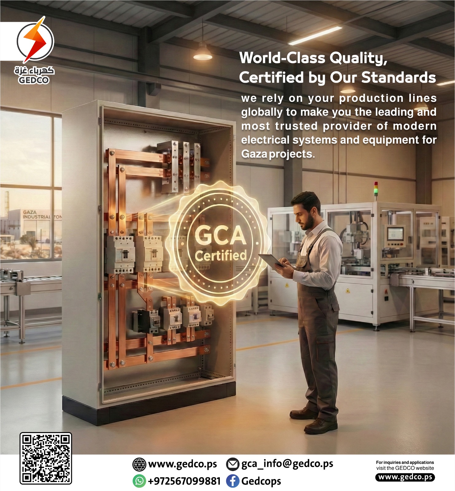 GEDCO has announced on Sunday, March 29, 2026, the launch of its Electrical Materials Qualification and Certification Service (GCA) ; technical service to ensure the quality, safety, and reliability of materials that will be used in the electricity distribution network and renewable energy systems. The initiative also aims to enhance confidence in both local and international electrical products, to meet the requirements for rebuilding Gaza’s electricity sector according to the highest recognized standards.
